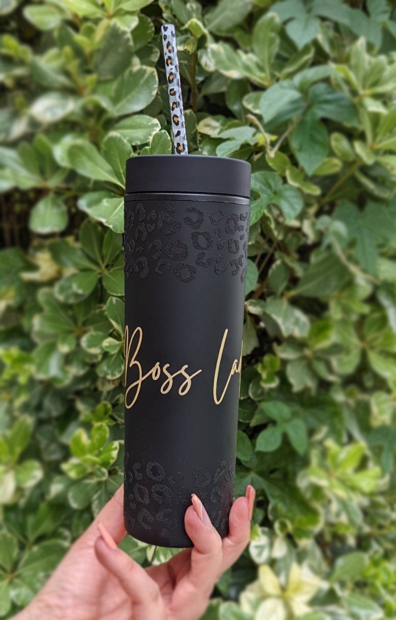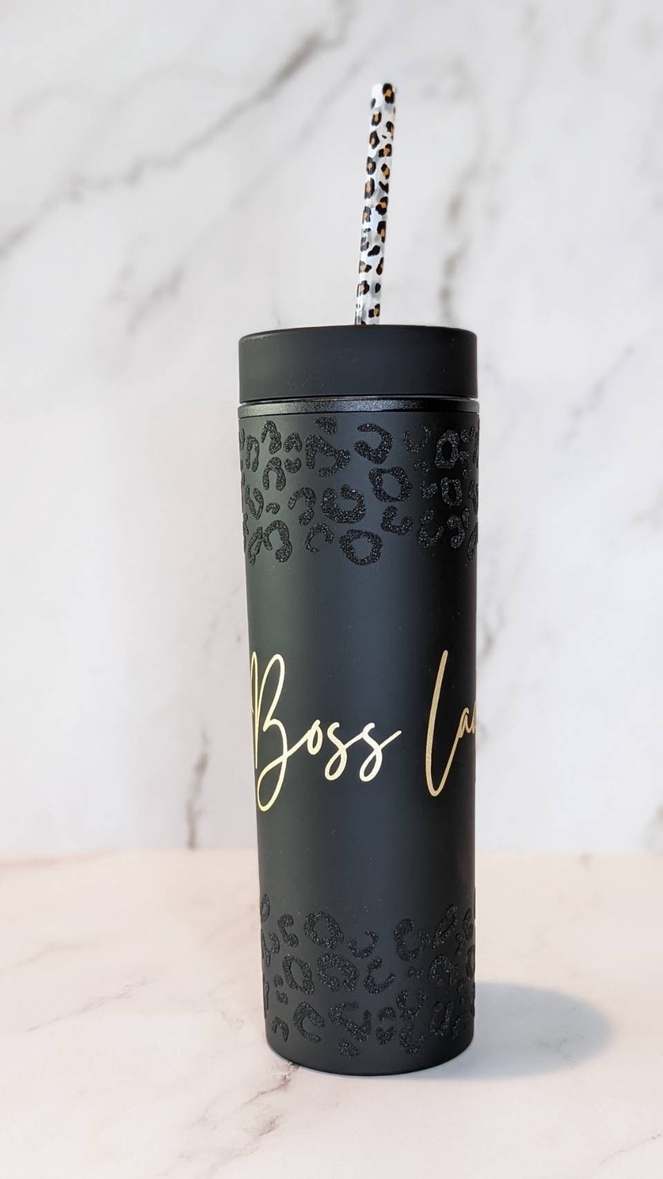 Matte Black Skinny 16oz Acrylic Insulated Tumbler, Boss Lady or Mama Leopard Glitter- Cute Decorative Straw BPA FREE